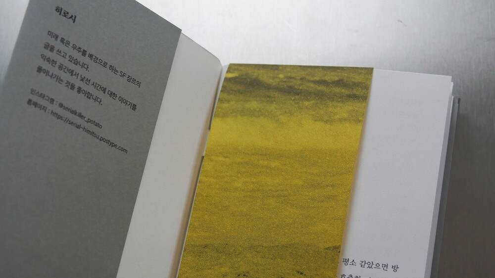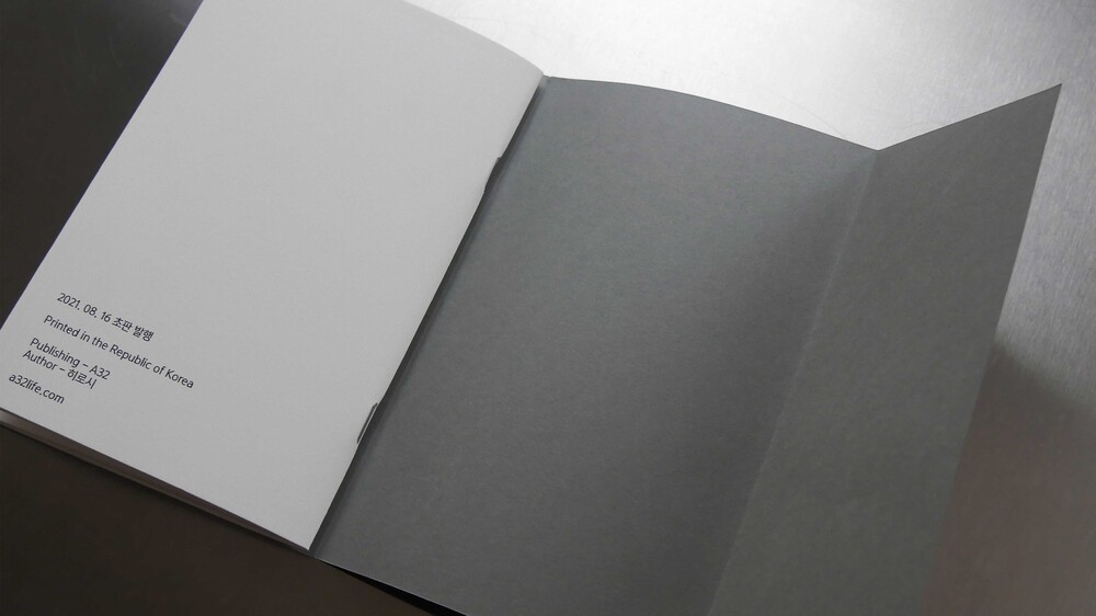 표지는 그레이색 120g/m²평량의 종이를 사용했고, 내지는 115g/m²평량의 화이트색 종이를 사용했습니다.